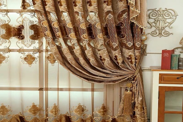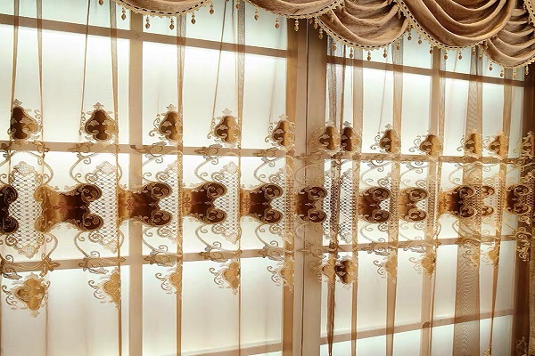 Và đây là hoạt tiết thêu trên vải cùng voan giuso bộ rèm thêm sắc nét, cầu kỳ hơ, đông thời toát lên những vẻ đẹp quyền quý cho qưn phòng