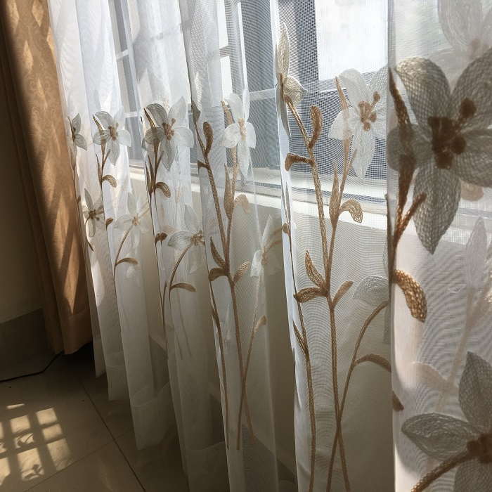 Rèm vải voan kết hợp với chi tiết thêu tay tạo nên sự quyến rũ của căn phòng