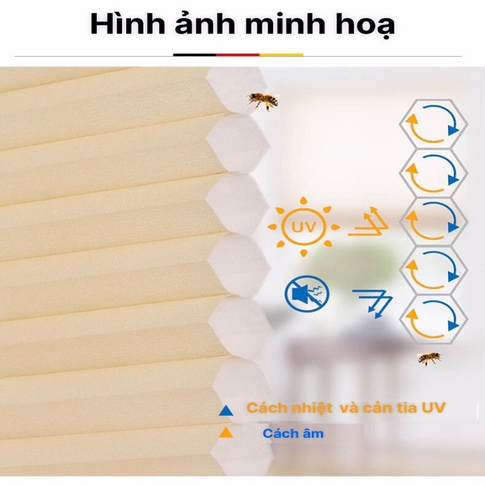 -Cấu tạo của Rèm tổ ong này được làm không quá cầu kì với 2 lớp chống nắng rất tốt, ở giữa có các ô hình lục giác giống như cửa của tổ ong giúp hạn chế tối đa nhất lượng ánh sáng vào trong căn phòng.